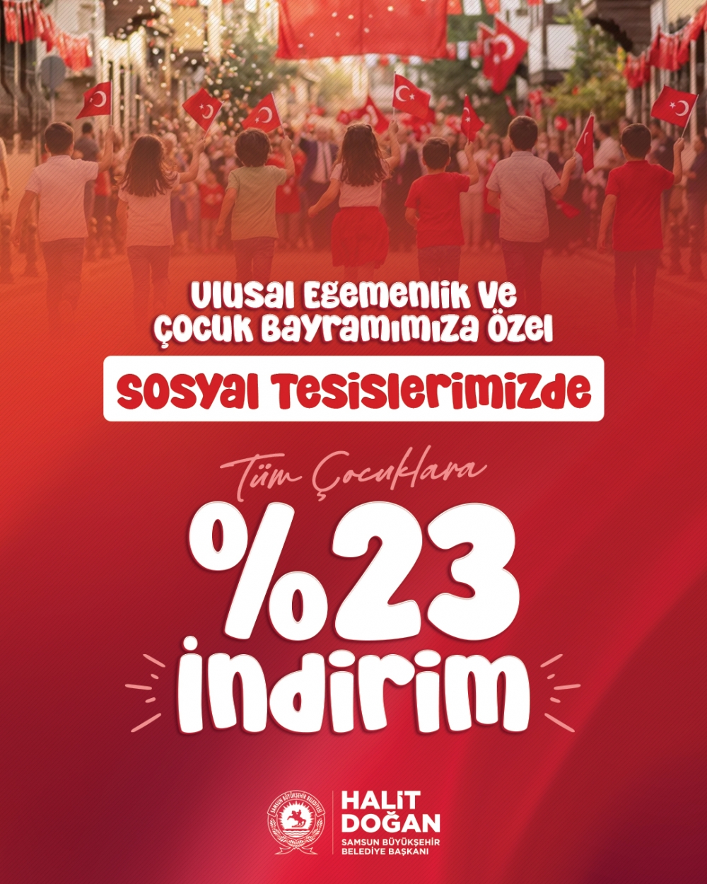 Samsun Büyükşehir Belediyesi aynı zamanda 23 Nisan Ulusal Egemenlik ve Çocuk Bayramı’na özel 23 Nisan Perşembe günü otobüs ve tramvay seferlerini ücretsiz hale getiriyor. Çocuklara armağan edilen bu özel günde Büyükşehir Belediyesi sosyal tesislerinde çocuklara yüzde 23 indirim uygulayacak.
